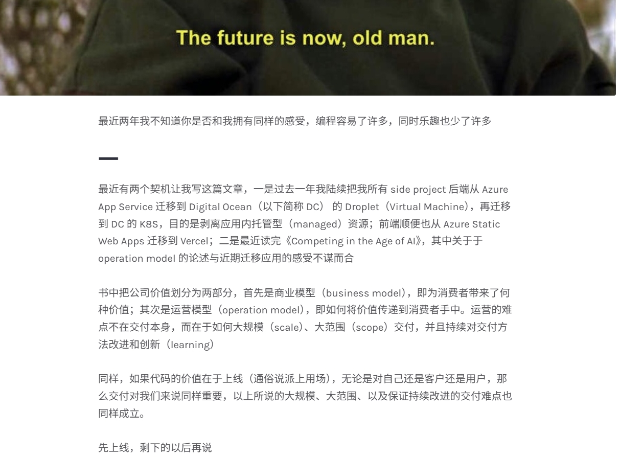 模板化的项目是带来这些便利的主要原因,大到新建一个项目小到执行编译,命令行一键完成,“也许是因为习惯了早年间凡事都需要自己动手的工作方式,我花了很长时间才想通并接受这件事,传统从0到1搭建项目的能力不再重要。”越来越多的环境像一个个黑盒出现在开发流程中,在此之前如果我对pipeline感兴趣,我可以阅读.github看action是如何定义的,现在我连机会都没有了。连同代码被一同干掉的还有程序员的编程乐趣。站在交付的角度上来说并没有什么道理,为什么我要花上几天的时间只为了研究如何写一段yaml把代码送上线运行,更何况这段代码带来不了任何“收益”。