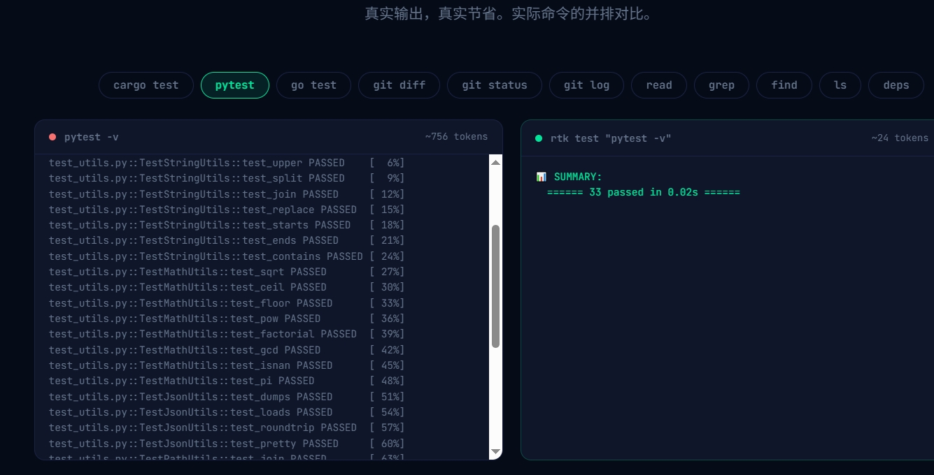 代理执行的每个命令都会产生一大长串输出,很多内容其实不需要。导致成本增加,上下文污染。而rtk的作用就是剔除不必要的输出,只把关键的结果输出给llm