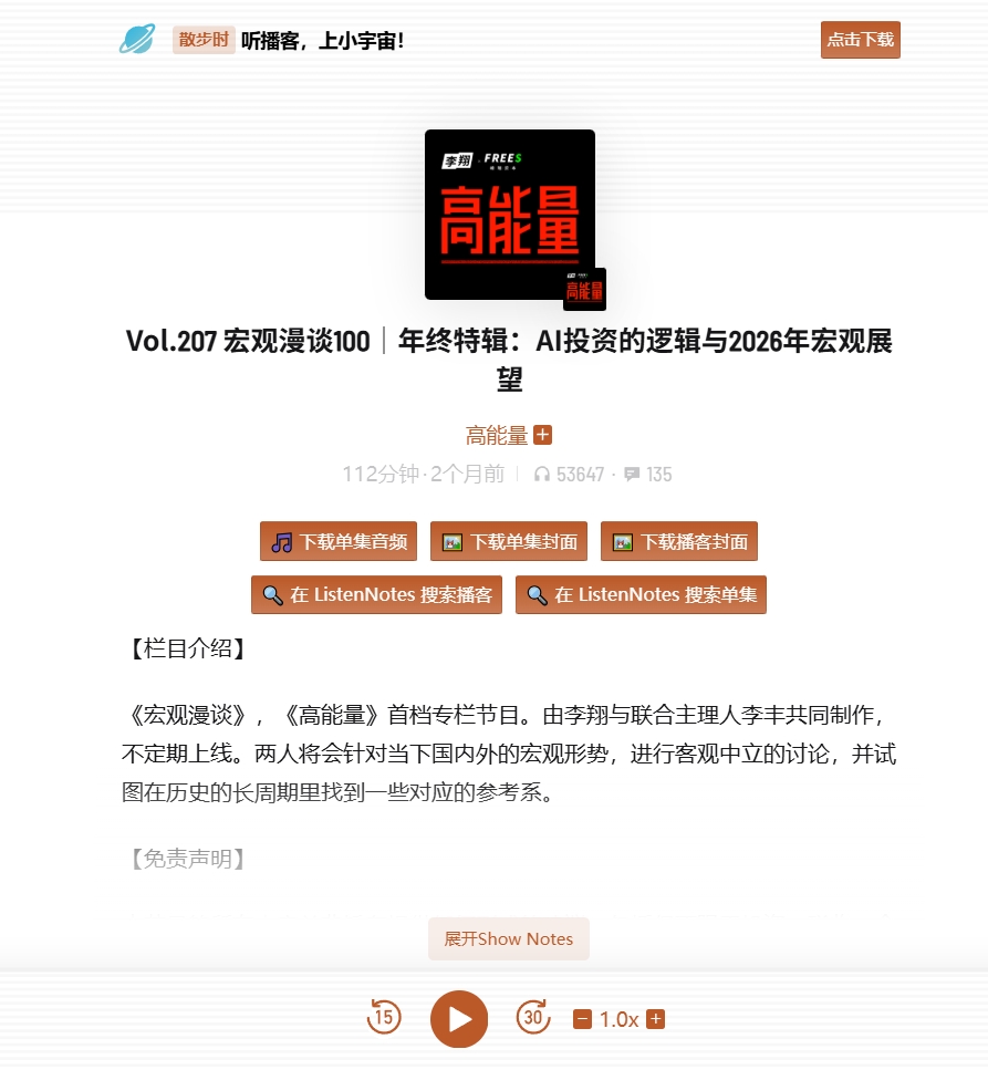 无意间刷到的一个播客,听完感觉经历了近十年科技史,以及了解了一些为何 ai 泡沫能持续这么久,黄金为何升值,以及 2026 年之后中国的国际地位和形势